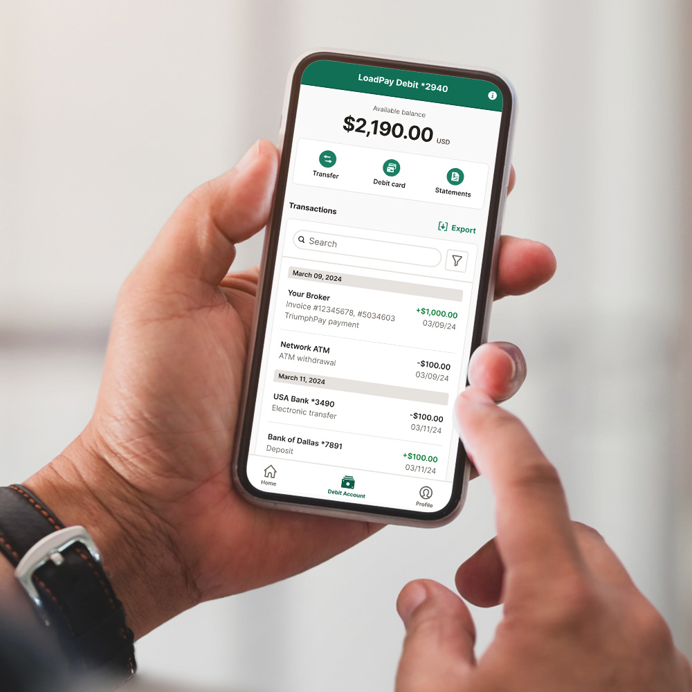Ouvrez un compte bancaire numérique LoadPayMC et déposez vos paiements de chargement pour être payé en quelques minutes si vous optez pour Factoring powered by Delta ou Quick Pay. De plus, obtenez un accès instantané à vos fonds — nul besoin d'attendre les chèques, les heures d'ouverture des banques ou les virements bancaires lents — et utilisez-les partout où MastercardMD est acceptée.