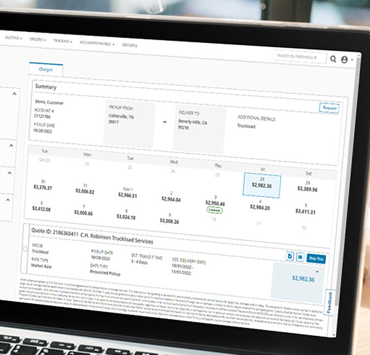 Faites des devis pour vos envois uniques et gérez vos exercices d'appels d'offres complexes avec un seul fournisseur. Découvrez les nombreuses façons de rationaliser votre processus d'achat de fret avec des taux de fret automatisés, concurrentiels et sécurisés. La disponibilité de la technologie varie selon les régions. Communiquez avec nous pour en savoir plus sur les outils et solutions disponibles dans votre région.